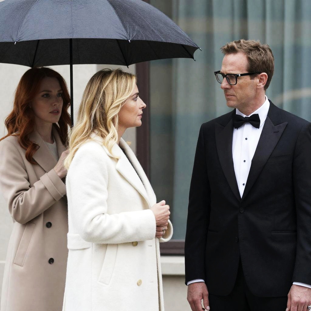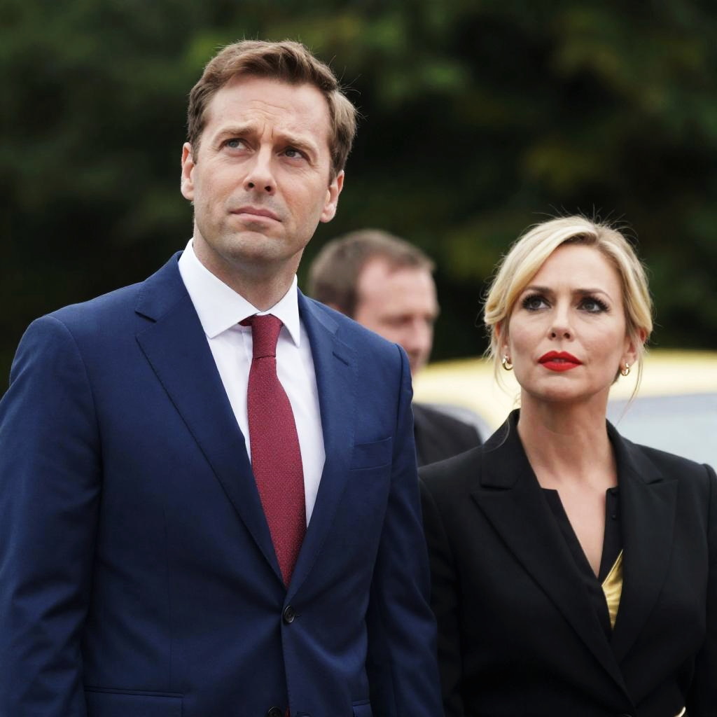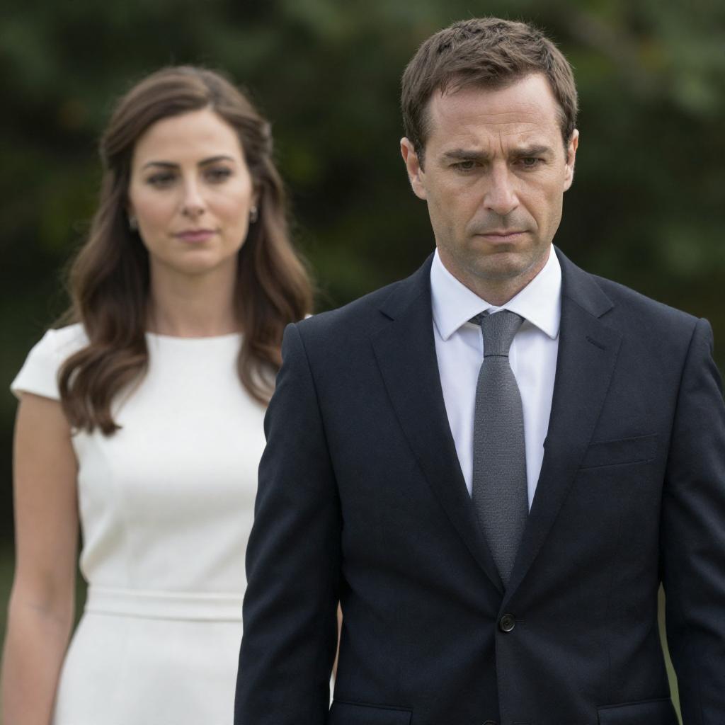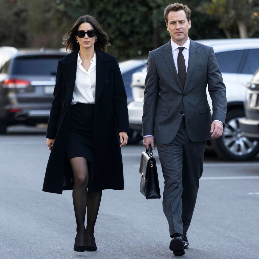 Photograph of a man and woman walking outdoors in a parking lot. Woman has dark hair, wears sunglasses, black coat, white blouse, black skirt, black tights, black heels. Man has brown hair, gray suit, white shirt, brown tie, black briefcase. Both look forward. Woman on left, man on right. Background includes cars, trees, and pavement.