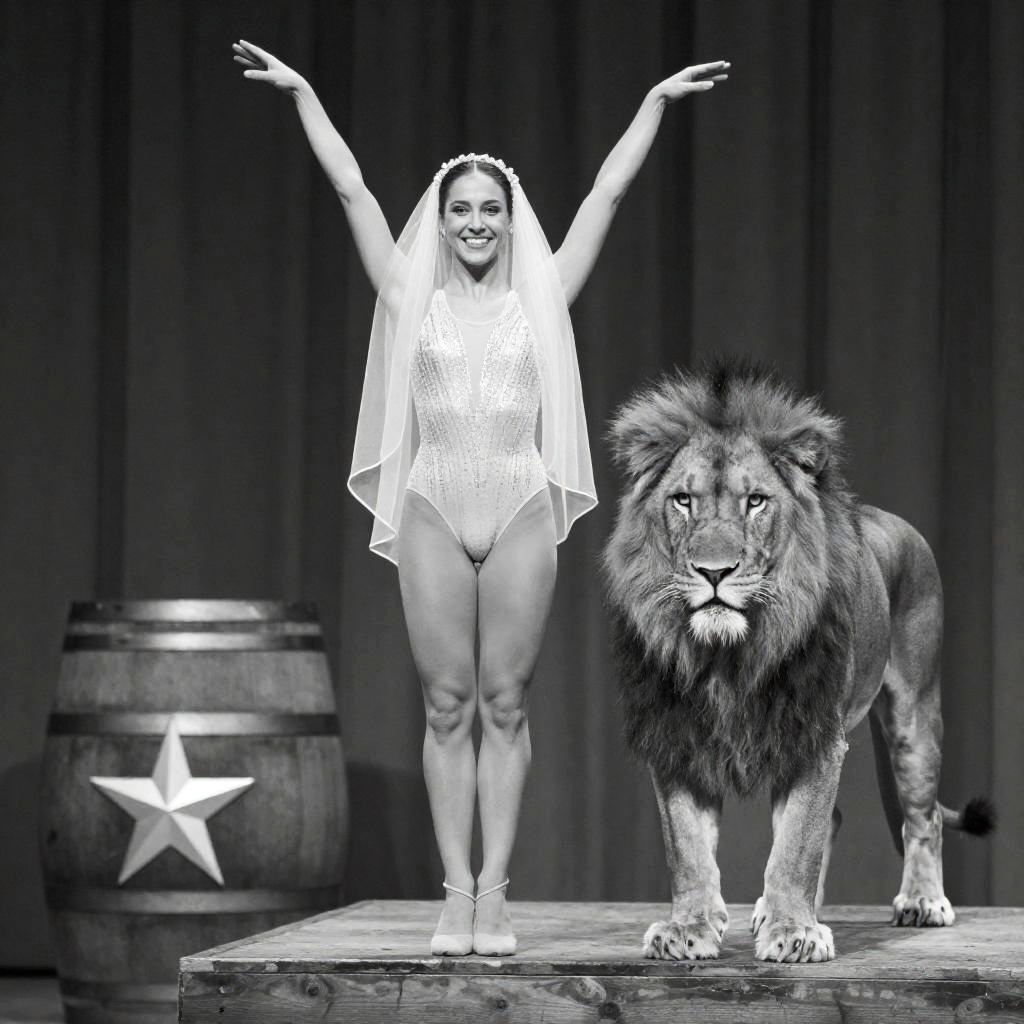 Black-and-white photo of a woman in a sparkly leotard and veil, standing with arms raised, next to a lion on a wooden platform. Cracked curtain background, barrel on left, star-shaped emblem. Woman smiles, lion stares intensely.