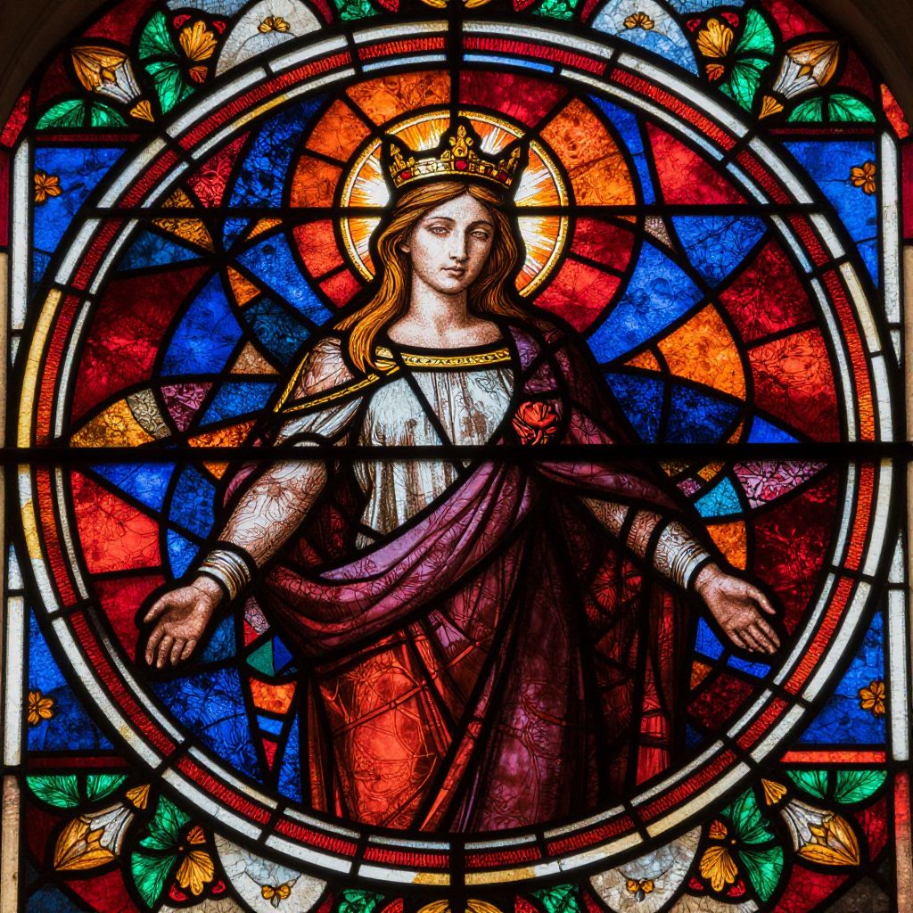 The image is a stunning example of stained glass artistry, reminiscent of the intricate designs found in historical churches. The central figure, a woman with long, flowing hair adorned with a crown, is depicted with a serene expression, her face illuminated by a halo of light. Surrounding her are vibrant, geometric patterns and floral motifs, rendered in a rich palette of reds, oranges, blues, and greens. The circular composition draws the viewer's eye inward, emphasizing the figure's prominence. The background features abstract shapes and textures, adding depth and complexity to the overall design. The interplay of light and color creates a sense of movement and energy, while the detailed craftsmanship highlights the skill and artistry of the artist.
