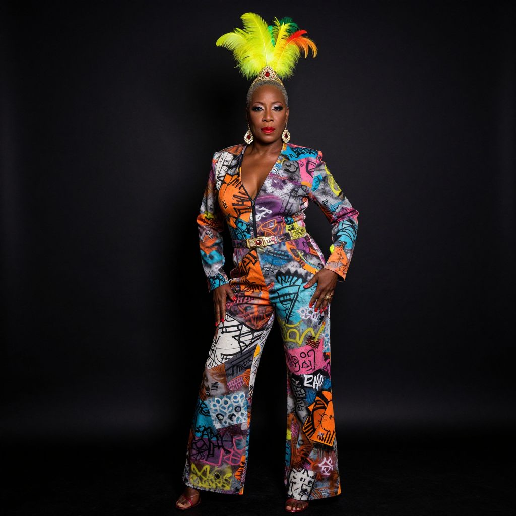 Photograph of a confident Black woman with dark skin, wearing a vibrant, graffiti-patterned jumpsuit, yellow feathered headpiece, and large earrings