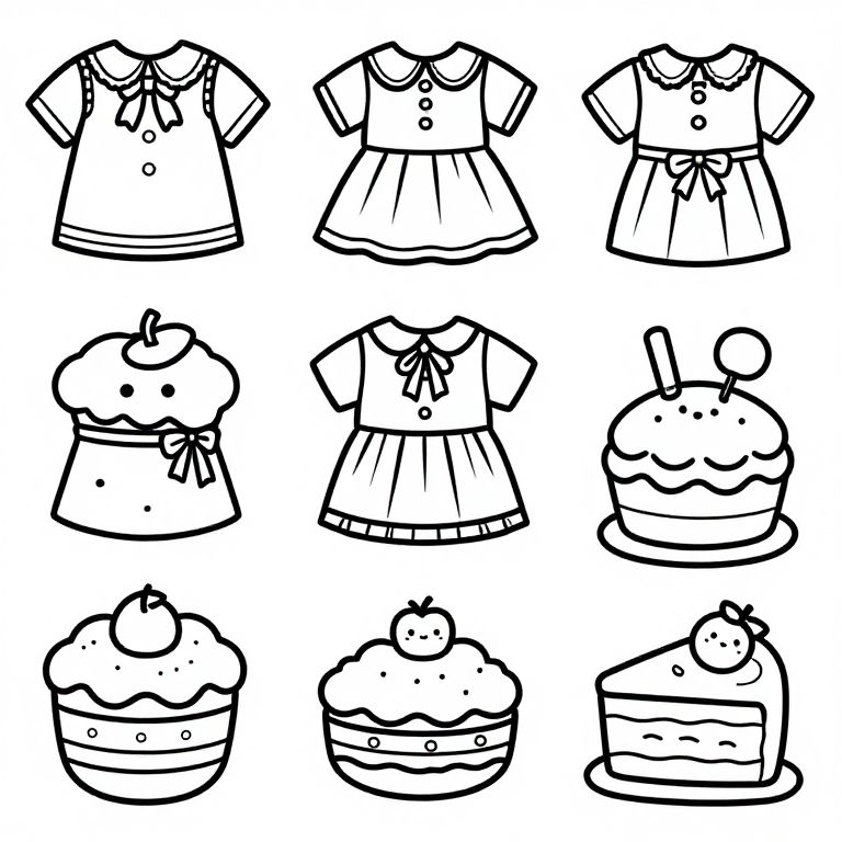 Medium Close-Up Shot Of Style Inspired Clothing, vibrant coloring page, kawaii style, crisp lines, white background, an assortment of desserts, no color, just black and white,