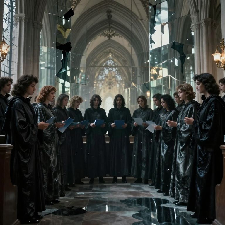In a silent cathedral of mirrors, a choir of shadowy angels sings hymns that ripple like ink through the glass.