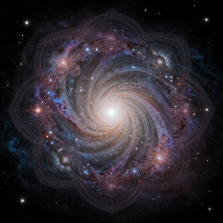 Photograph-like digital rendering of a spiral galaxy with a bright, glowing core at the center. The galaxy's swirling arms are filled with colorful nebulae in hues of blue, purple, and pink, surrounded by numerous white and blue stars. Dark, intricate, circular patterns overlay the galaxy, giving it a mystical appearance. The background is a dark, starry space, enhancing the galaxy's luminosity and vibrant colors. The overall composition is symmetrical and visually striking.