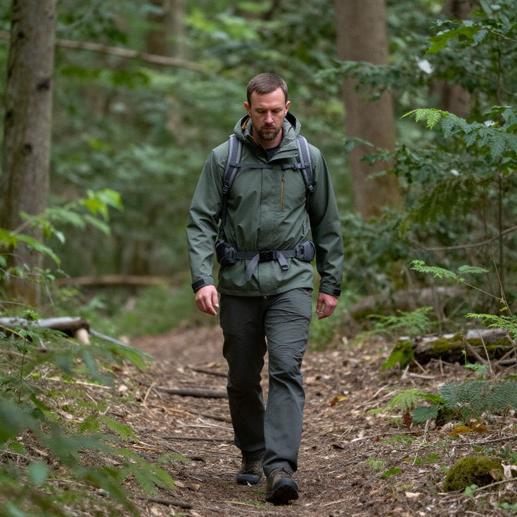 Photograph of a middle-aged Caucasian man with short brown hair and a beard, walking on a forest trail. He wears a green, waterproof hiking jacket with a black backpack, black pants, and black hiking boots. The forest is dense with tall trees and lush green foliage. The dirt path is lined with moss and fallen leaves. The man looks focused, with a slight smile, as he walks straight ahead. The background is blurred, emphasizing the depth of the forest. The image has a natural, slightly overcast lighting, creating a serene atmosphere.