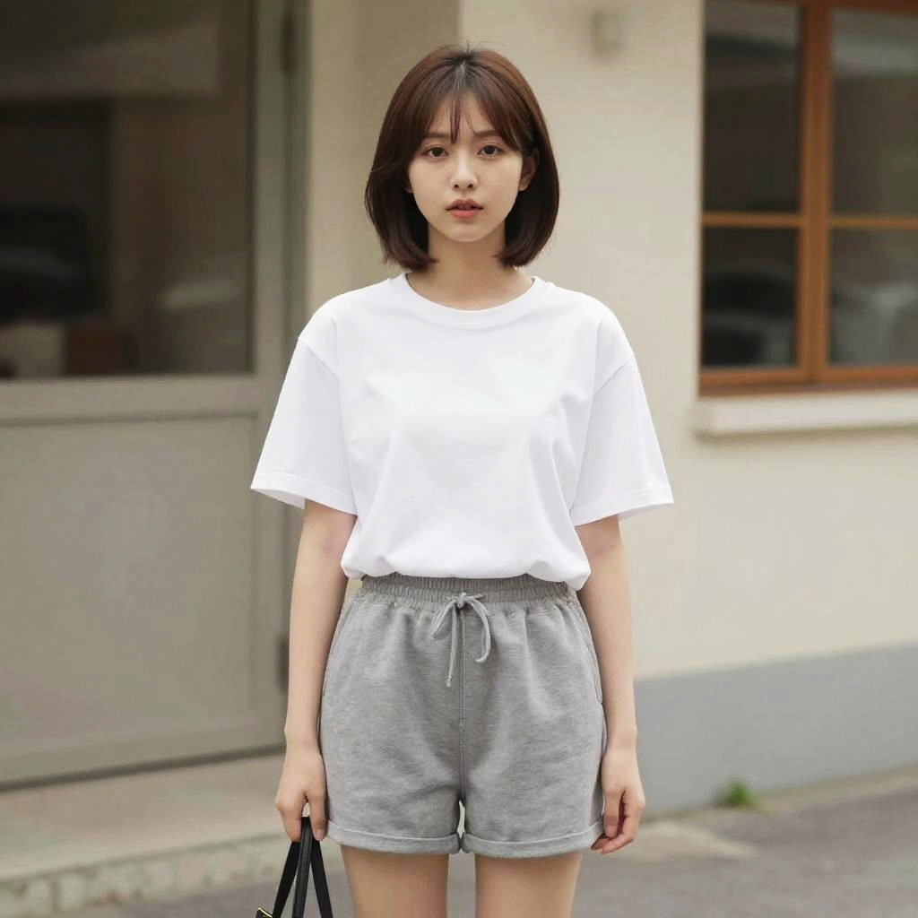 A young woman with curly hair wearing light grey wool coat and beige culottes standing outdoors in front of a building with muted colors, soft natural light, casual cozy atmosphere, neutral color scheme with grey and beige tones