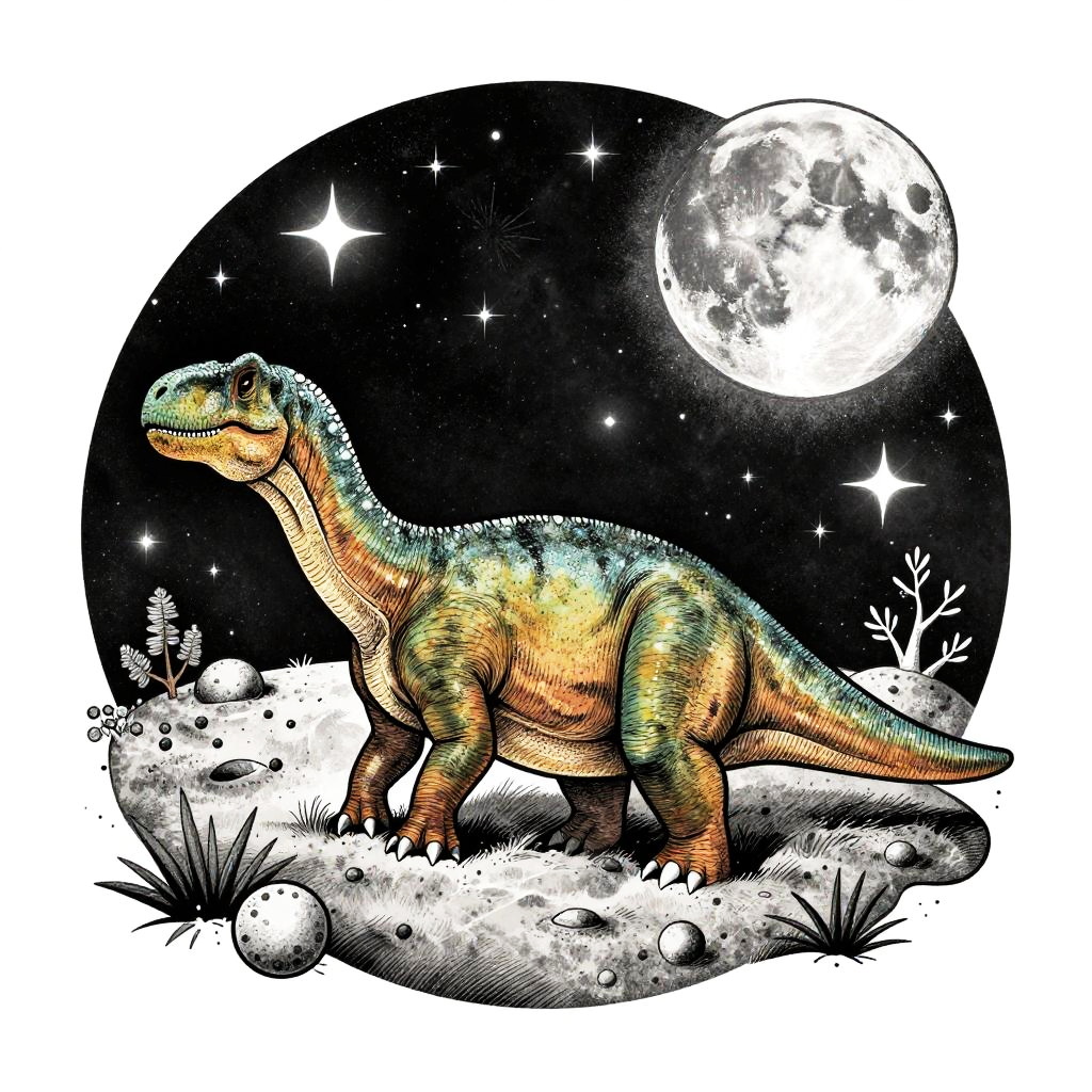 Illustrative space dinosaur tattoo of a brachiosaurus resting on a moon surface, celestial bodies and star clusters overhead, fine dotwork and shading, cosmic mystery with earthy dinosaur textures blending seamlessly with interstellar elements, colorful yet subtle palette.