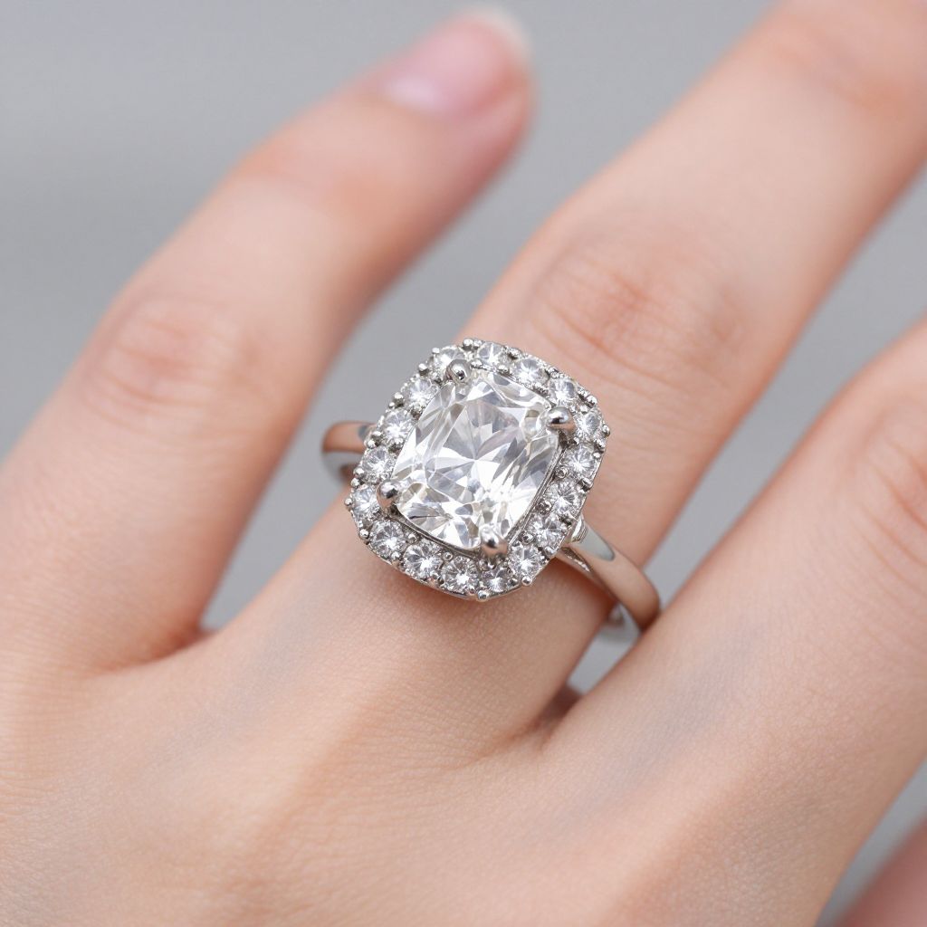Elegant vintage engagement ring featuring a 1.10ct emerald-cut diamond surrounded by a halo of smaller diamonds, set in a delicate antique-style band, showcased gracefully on a woman's finger.