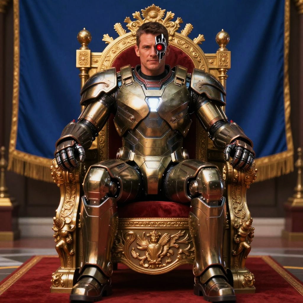 Volumetric cinematic lighting, (highly detailed:1.4), digital render, smooth, sharp focus, full body 8k render, action shot, realistic reflections, cinematic composition, calgar, solo, 1boy, middle aged man, military man, bionic eye, one glowing red eye, power fist, pauldron, iron halo, poised, close-up, upper body, portrait, sitting, sitting on throne, large blue flag background, red carpet, regal
