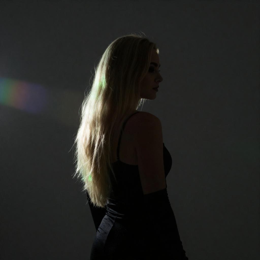 Photograph of a silhouetted woman with long, straight blonde hair, wearing a black top and gloves, standing against a dark background. A bright light source from the right creates a greenish glow on her hair and a colorful lens flare on the left. Her back is slightly turned, highlighting her profile.