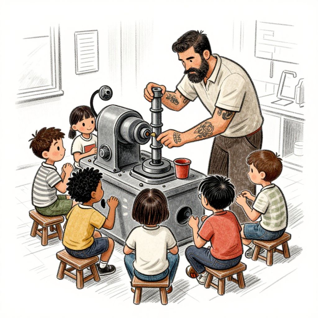 A man with a beard and tattoos teaches six children how to fix a large machine in a hand-drawn, illustrated sketch.