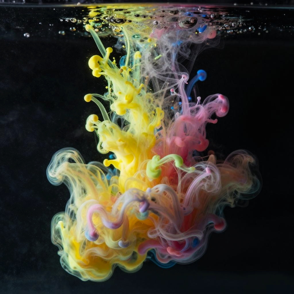 Unstable diffusion illustrated as a turbulent explosion of ink and smoke in water, with splashes of bright fluorescent hues mixing erratically against a stark black background, highlighting fluid dynamics and chaotic beauty in macro detail.