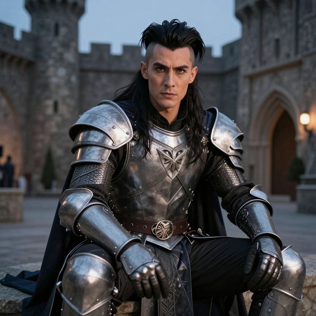 A strong, athletic male with long, dark hair styled with a high-volume undercut and side layers, wearing a gothic-themed fantasy costume with silver armor and a flowing cape, sitting in a dimly lit medieval castle courtyard at twilight, realistic lighting, expressive face with a serious gaze