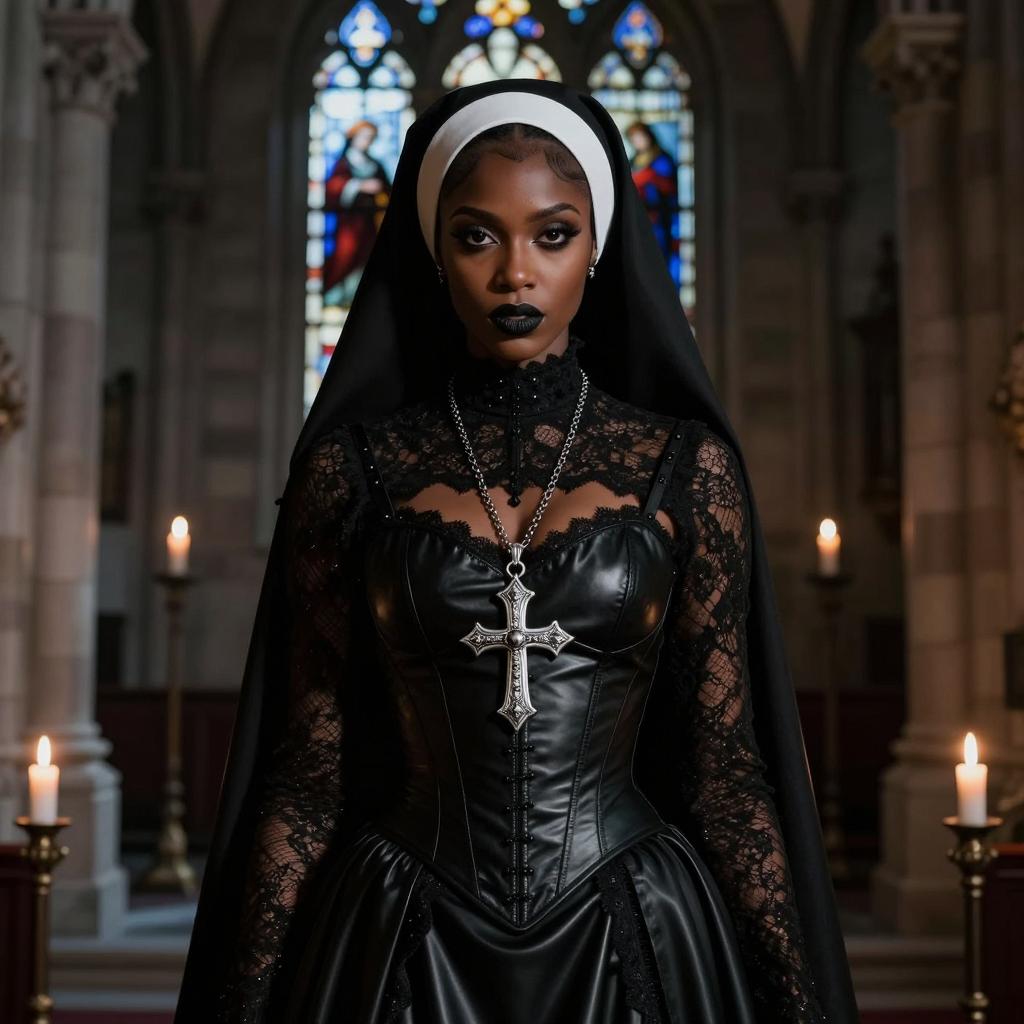 A dark-skinned woman dressed in a gothic black leather and lace nun outfit stands inside a dimly lit church. She wears a large silver cross necklace and a traditional white and black nun's headpiece. The background features dark stone pillars, stained glass windows, and glowing candles, creating a moody, mysterious atmosphere. The dramatic lighting highlights her intense eyes and the intricate details of her clothing.