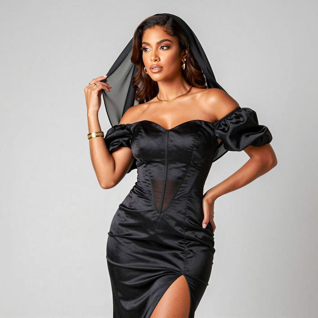A striking dark-skinned woman dressed in a gothic black leather and lace nun outfit, standing in a dimly lit church interior with glowing candles around her, wearing a large silver cross necklace, dramatic moody lighting highlighting her intense eyes and intricate clothing details, gothic and mysterious atmosphere, dark stone pillars and stained glass in the background