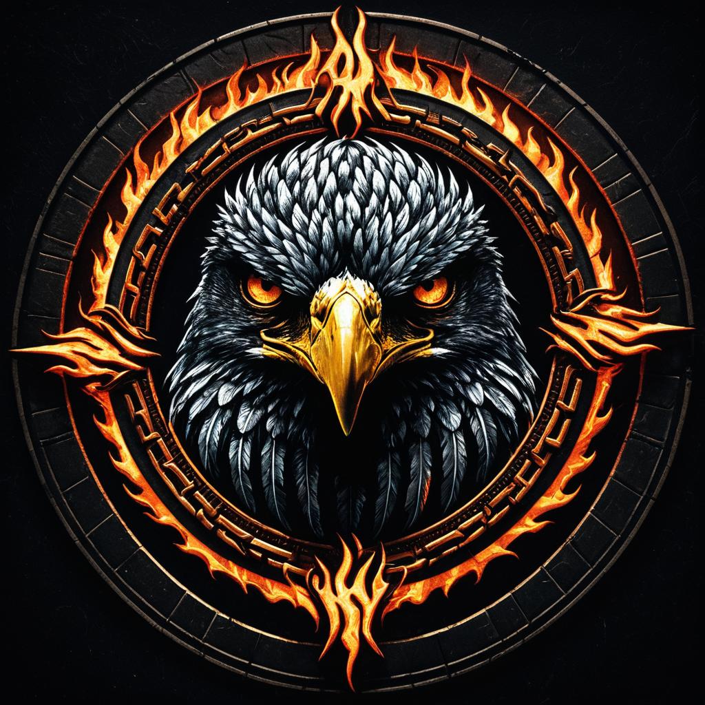 A symmetrical illustration of a draped hawk's head with detailed feathers and intense fiery orange eyes. The hawk's golden beak is prominent, surrounded by a circular ring of stylized flames and intricate dark metallic elements. The design has a dark, dramatic atmosphere with strong rim lighting emphasizing the detailed textures and fiery theme.