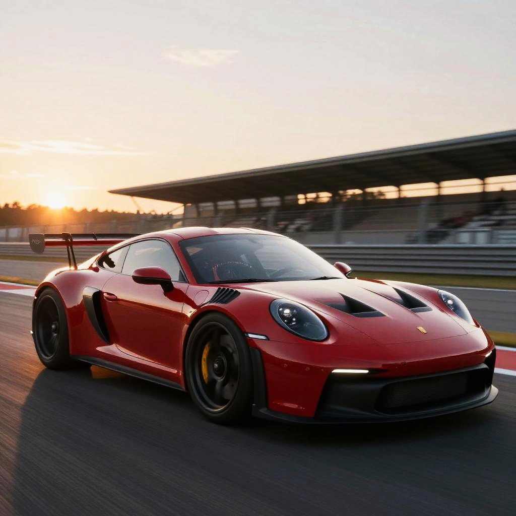 GT1RS racing car speeding on a professional race track at sunset, sleek aerodynamic design, glossy red paint with black accents, detailed tires and sponsor decals, motion blur effect, hyper-realistic style