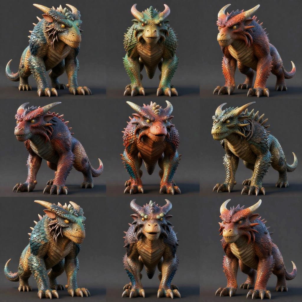 3d model references of fantasy creatures with exaggerated features, vibrant colors, dynamic poses, highly detailed skin and scales, dramatic lighting with shadows