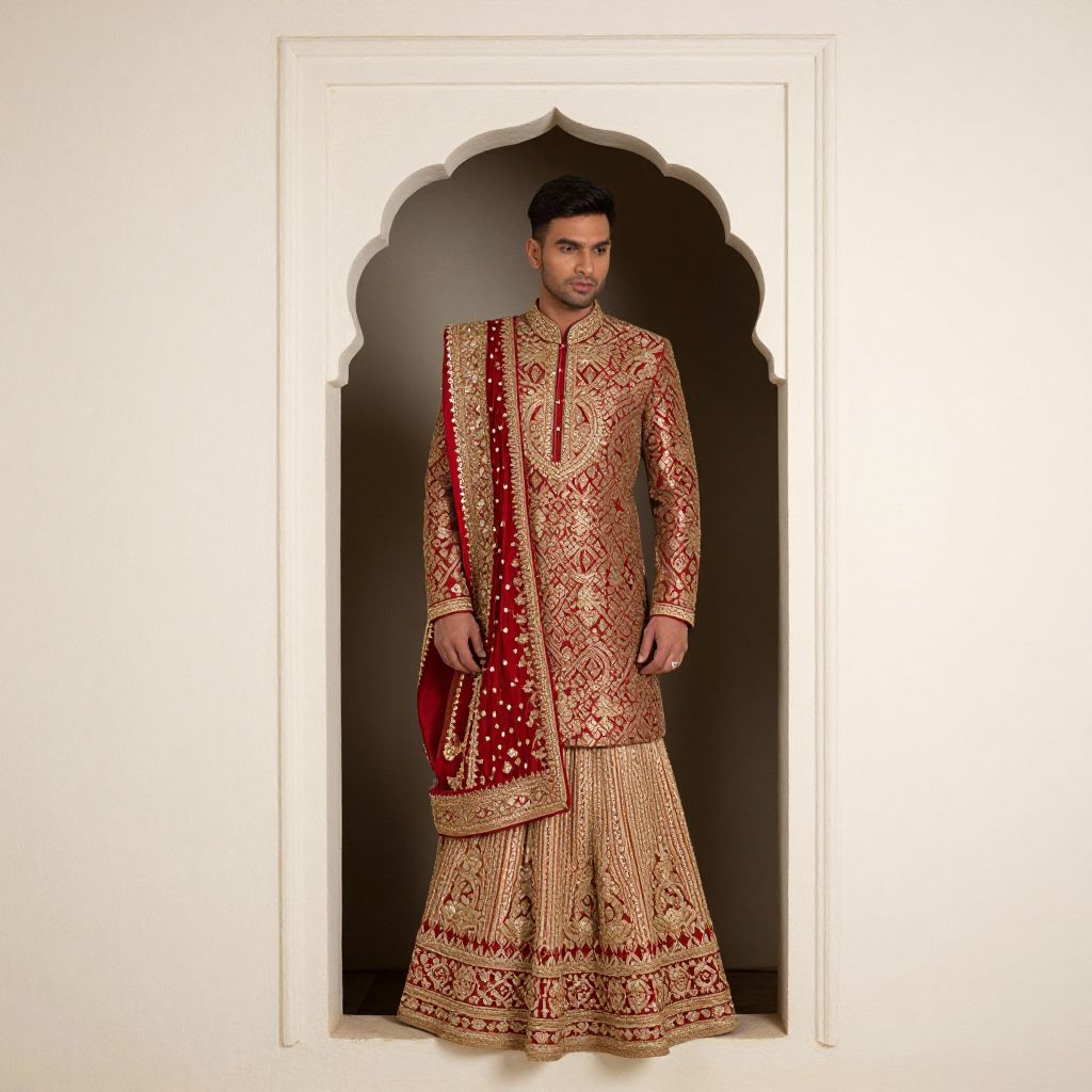 Photograph of a young South Asian man with medium brown skin and black hair, standing in a white, ornately framed archway. He wears a traditional, intricately embroidered red and gold sherwani with a matching dupatta draped over his left shoulder. The sherwani features detailed paisley and floral patterns, and the dupatta has white polka dots. The background is a simple dark gradient, highlighting the rich colors and textures of the attire. His expression is neutral, and he stands with his right hand slightly raised. The overall style is formal and elegant.