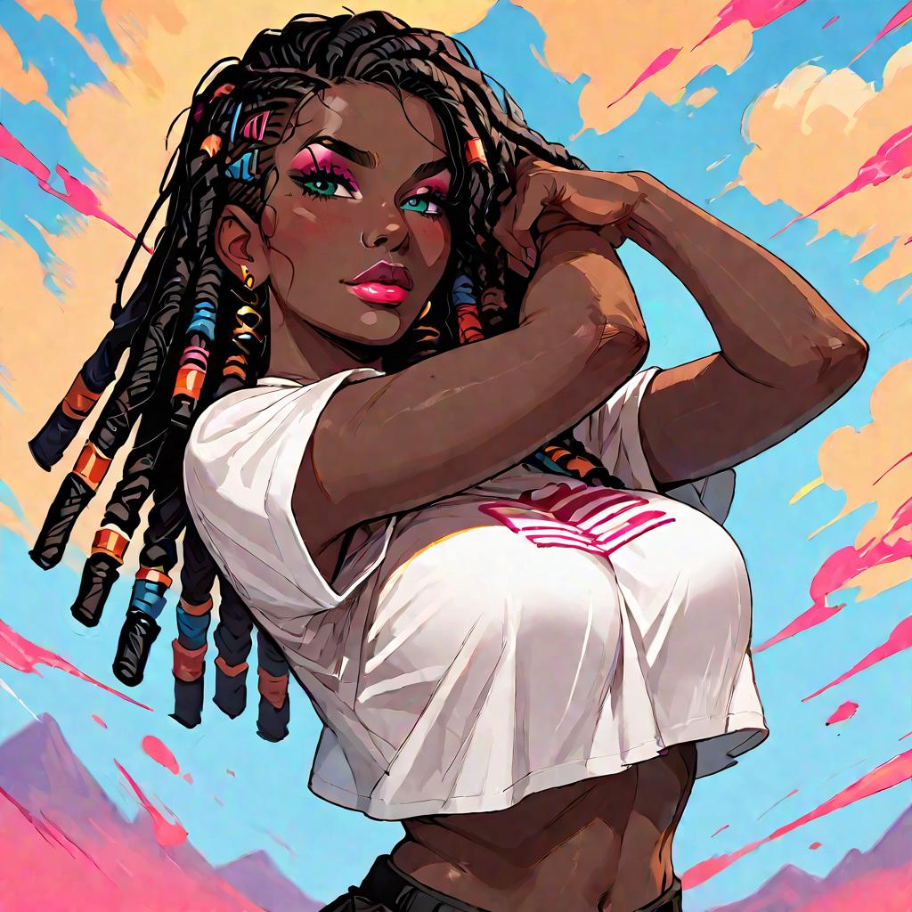 Score_9, score_8_up, score_7_up, source_anime, rating_explicit, uncensored, 1girl, african, dreadlocks, black hair, dark skin, long hair, large breasts, crop top, Fighting pose, upper body, looking at viewer