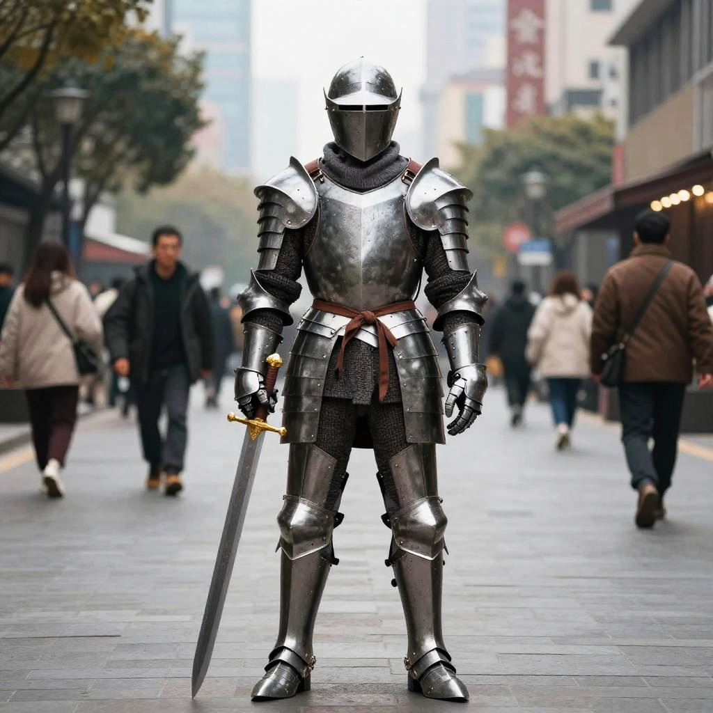 A person dressed in full medieval knight armor, including a helmet with a visor, standing on a busy city street. The individual is wearing a chainmail suit under the metal plates and holding a longsword with a decorative golden hilt. The background shows an urban setting with pedestrians walking and tall buildings partially visible in the distance.