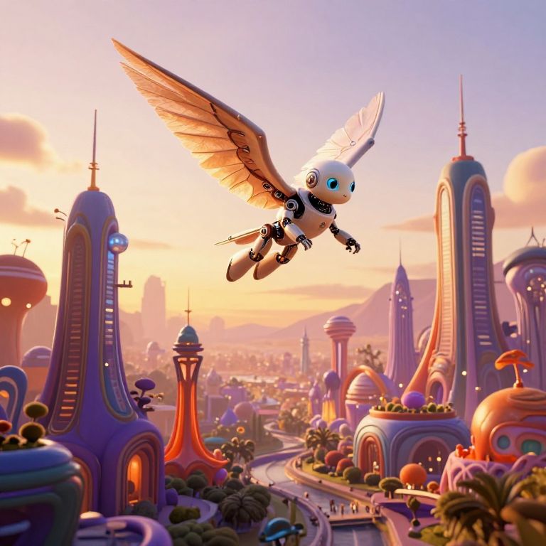 A whimsical robotic creature with delicate wings soars over an enchanting cityscape under warm golden hour lighting, inviting viewers to explore this captivating world through its perspective. The skyline is filled with towering structures that seamlessly blend nature and technology, evoking a symphony of colors from deep purples to fiery oranges. This fantastical scene exudes curiosity and wonder, reminiscent of Da Vinci's \"The Flying Machine,\" while the organic architecture of the cityscape suggests a future where innovation meets enchantment.