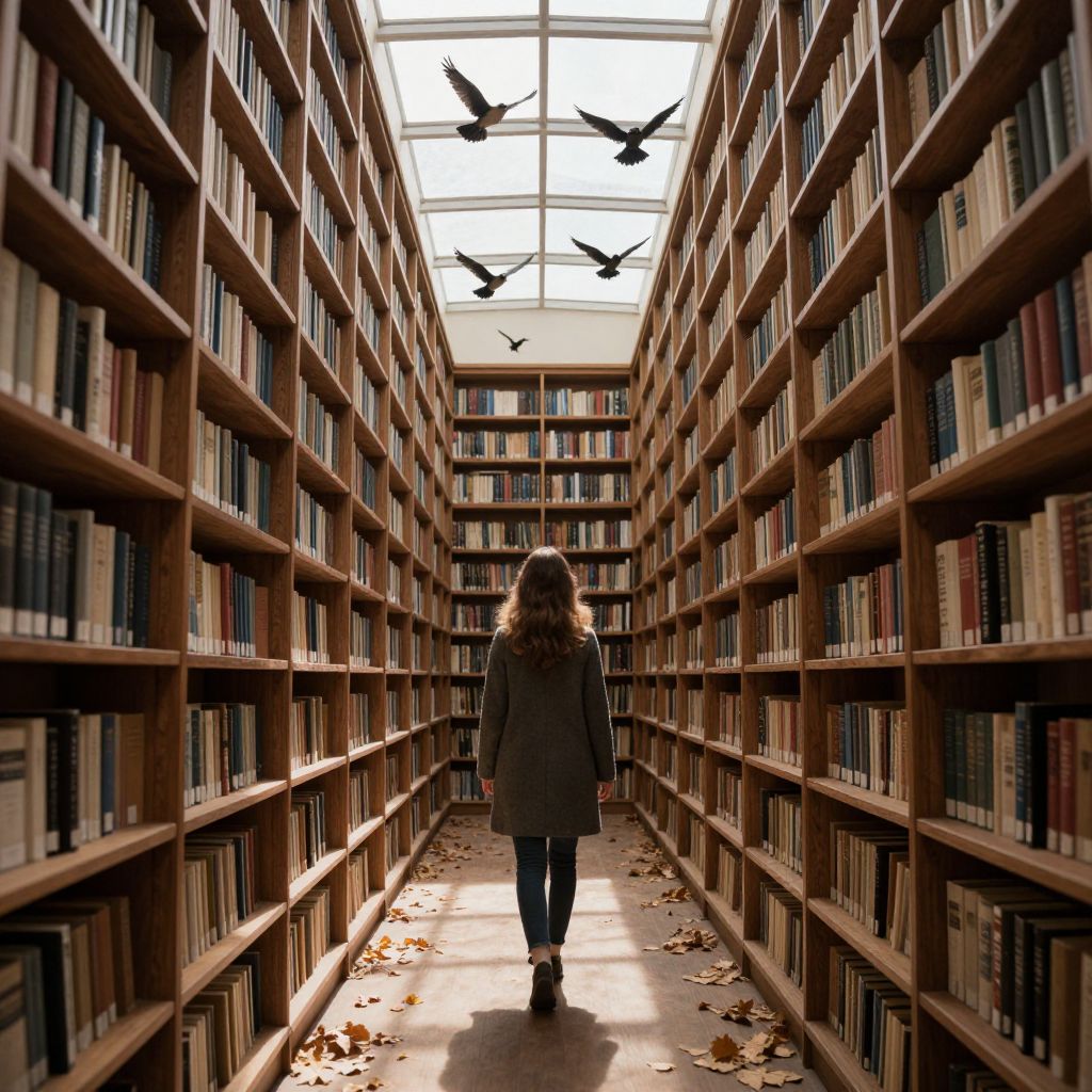 Photograph of a library aisle with a woman standing in the center, viewed from behind. She has wavy, brown hair and wears a gray coat and blue jeans. Tall wooden bookshelves filled with books line both sides of the aisle, extending into the background. The ceiling has large glass panels allowing sunlight to stream in, illuminating the scene and casting shadows. Four black birds are flying near the top of the shelves. Fallen leaves are scattered on the floor, adding an autumnal feel. The perspective creates a sense of depth and solitude.