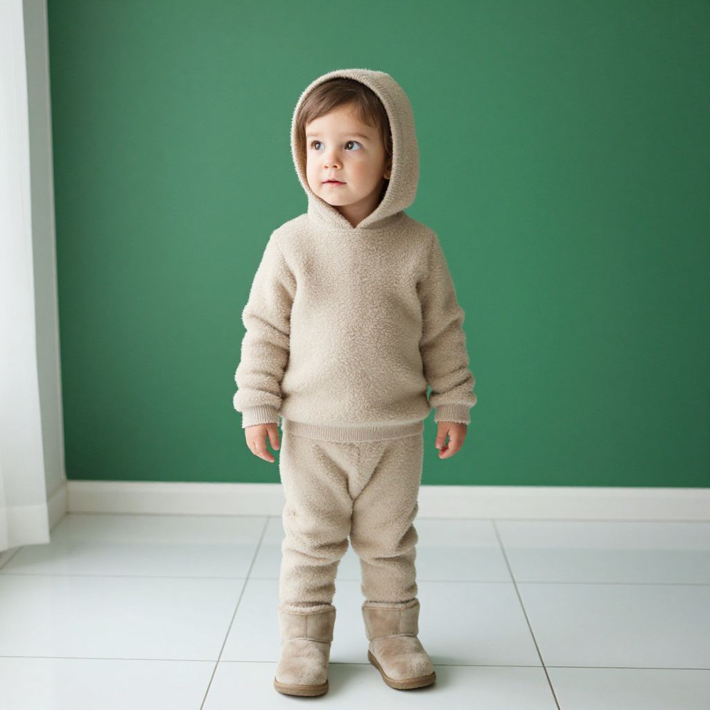 A young child, around 5 years old, is wearing a cozy beige outfit with a soft hood and a pair of warm beige boots. The child is standing still on a clean, white tiled floor, with a vibrant green wall in the background. The room has a quiet, inviting atmosphere, with soft natural light streaming in from the side. The child looks slightly curious, with a gentle expression, eyes slightly upturned, as if observing their surroundings. The scene is simple and warm, emphasizing the innocence and charm of childhood.