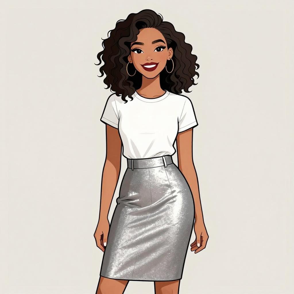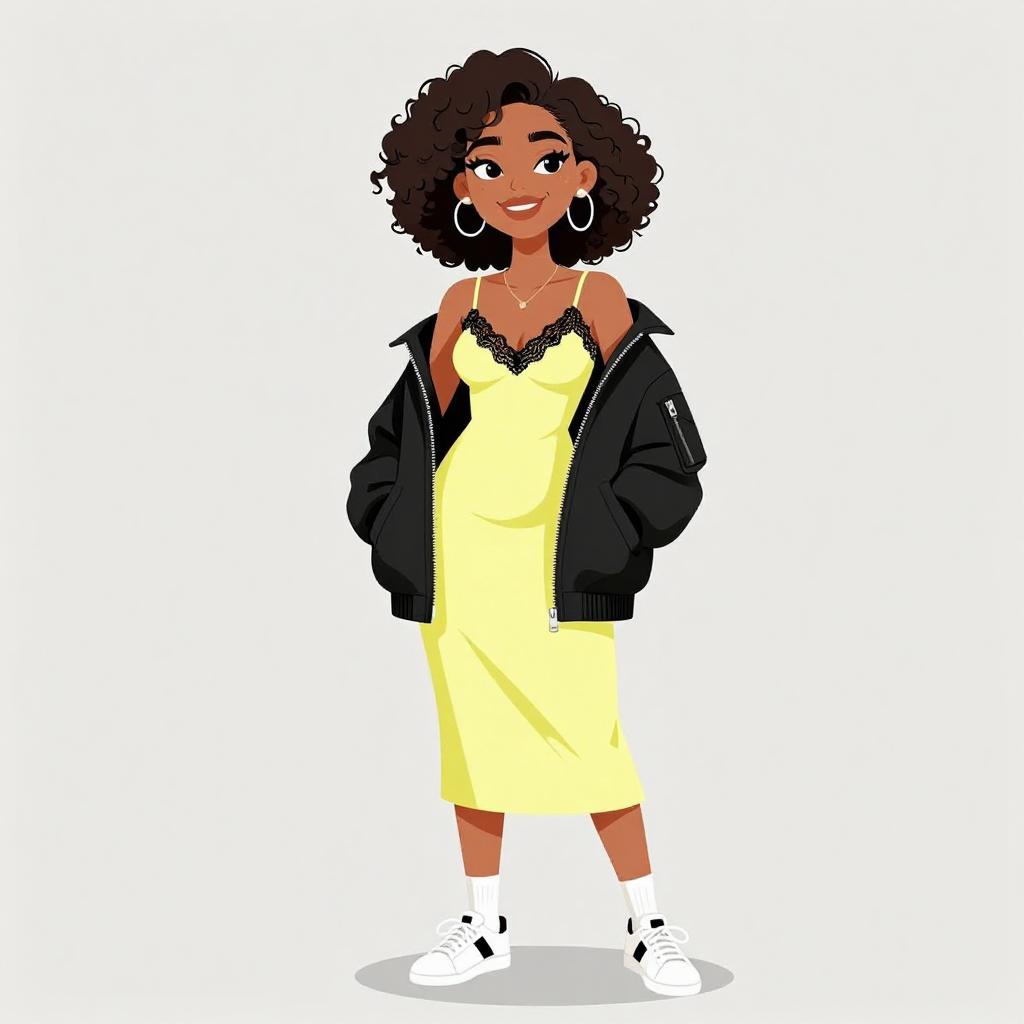 Woman with pretty face and pretty hair. smiling Woman, streetwear chic, pastel lemon slip dress with black lace trim, v-neckline, spaghetti straps, oversized black bomber jacket with strap details, mid-thigh length jacket, white ankle socks, white sneakers with black detail, natural afro hairstyle, photo studio with plain light background --sref 1467