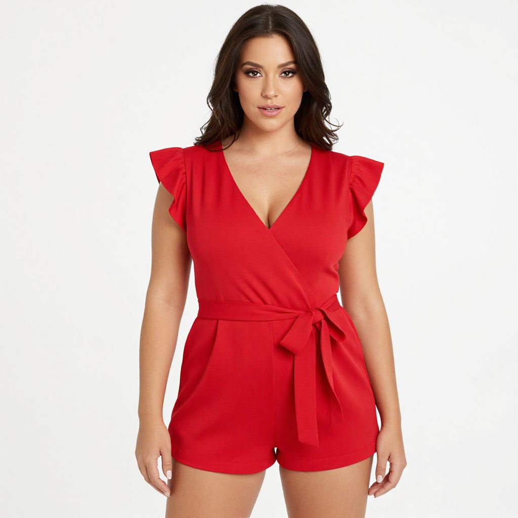 "Woman, playful chic, red romper with a v-neckline, short ruffle sleeves, cinched waist with a tie belt, short length, solid color, plain white background.. Sexy. Pretty face and beаutiful eyes. Big breasts."