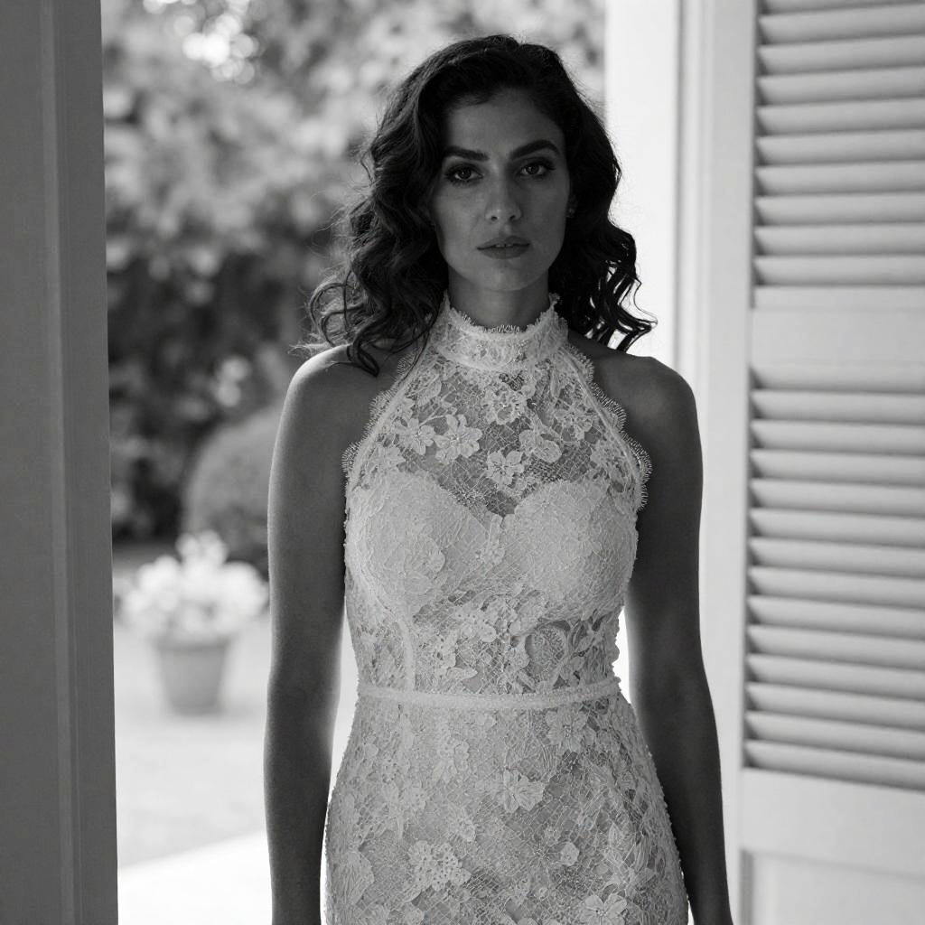 Black and white photograph of a woman with wavy, dark hair, wearing a lace, sleeveless, high-neck dress with sparkling details. She stands in a doorway, facing forward with a neutral expression. Background includes a blurred outdoor garden scene. Right side has louvered doors.