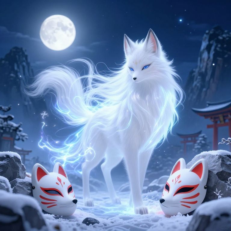 Digital art depicting a luminous white fox with flowing, ethereal fur standing in a snowy, moonlit landscape. The fox, glowing with a radiant blue-white light, has piercing blue eyes and a majestic presence. Two white fox masks with red markings lie in the snow at its feet. In the background, snow-covered mountains and a traditional Japanese torii gate are visible under a bright, full moon. The scene is mystical and serene, with a strong contrast between the glowing fox and the dark, starry night sky.