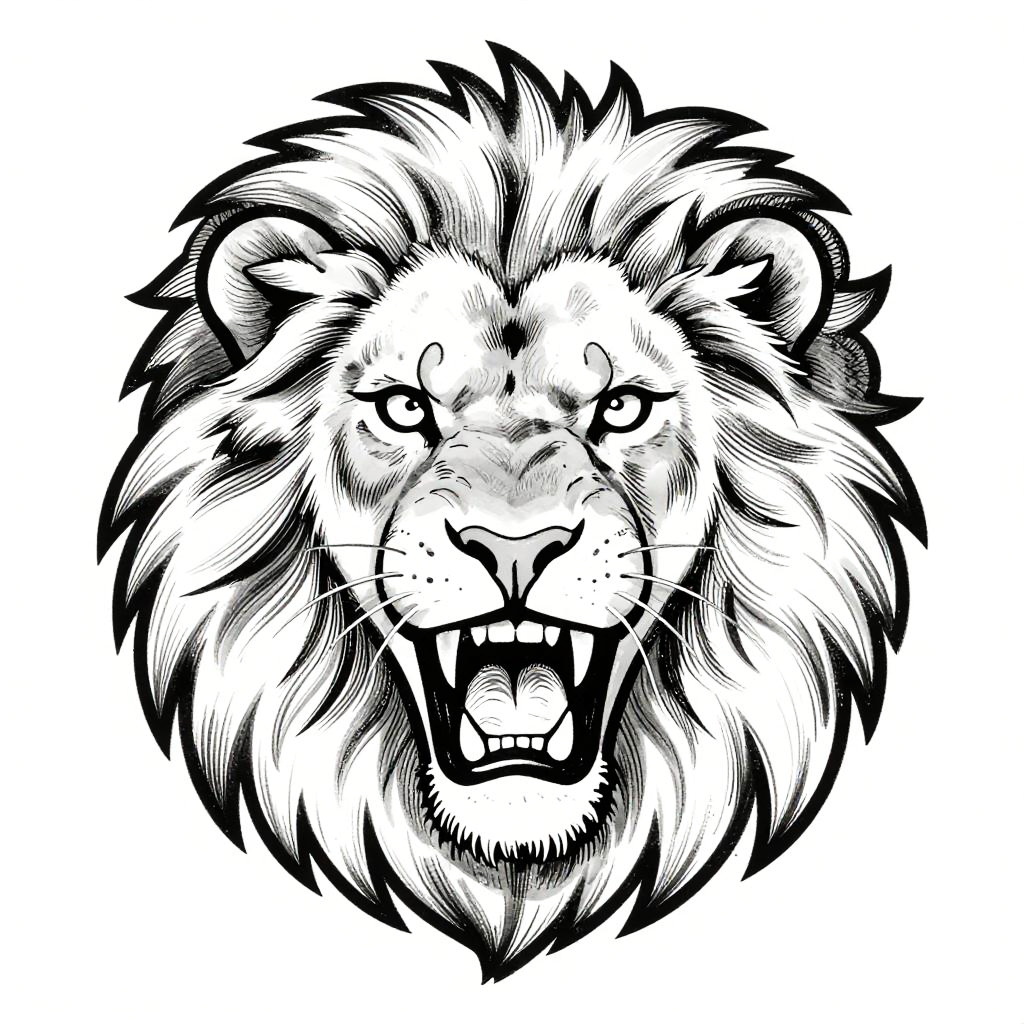 Black and white ink drawing of a roaring lion's head with detailed, fierce expression and thick, spiky mane. Bold, dynamic lines highlight aggressive energy