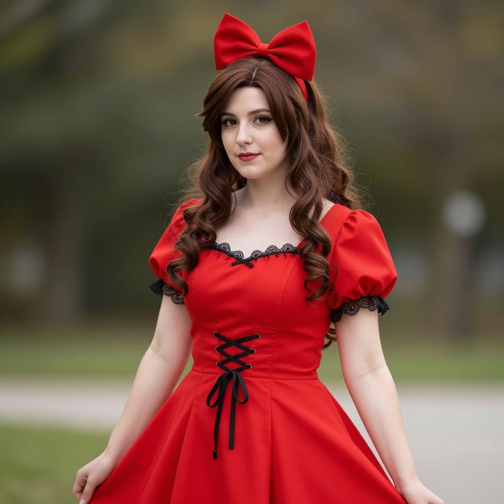 Photograph of a young woman with pale skin and long, wavy brown hair, wearing a bright red, puffed-sleeve dress with black lace trim and a black ribbon corset in the front. She has a large red bow atop her head and subtle red lipstick. Her eyes are accentuated with dark eyeliner. The background is blurred, featuring green foliage and a white pathway. The overall style is reminiscent of Alice in Wonderland, with a focus on vibrant colors and classic fairytale elements. The image has a slightly soft, dreamy quality.