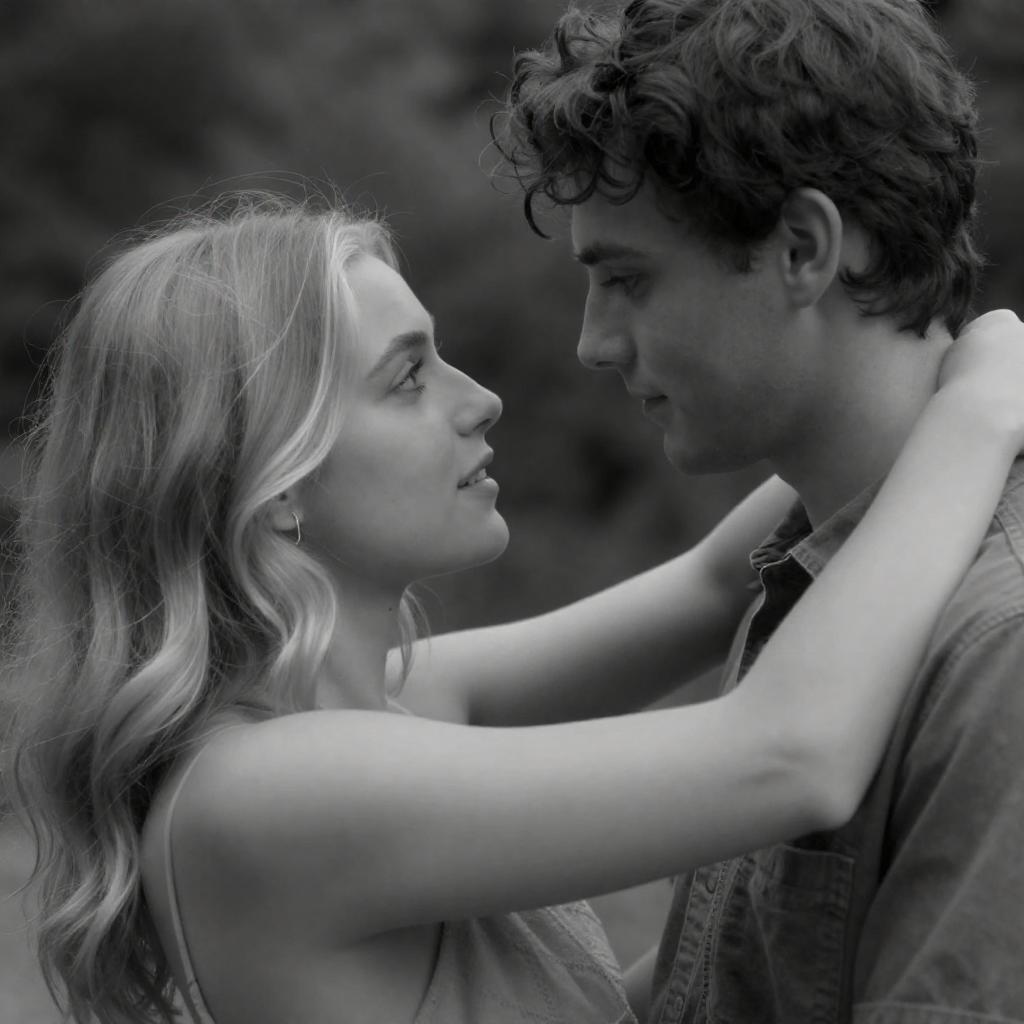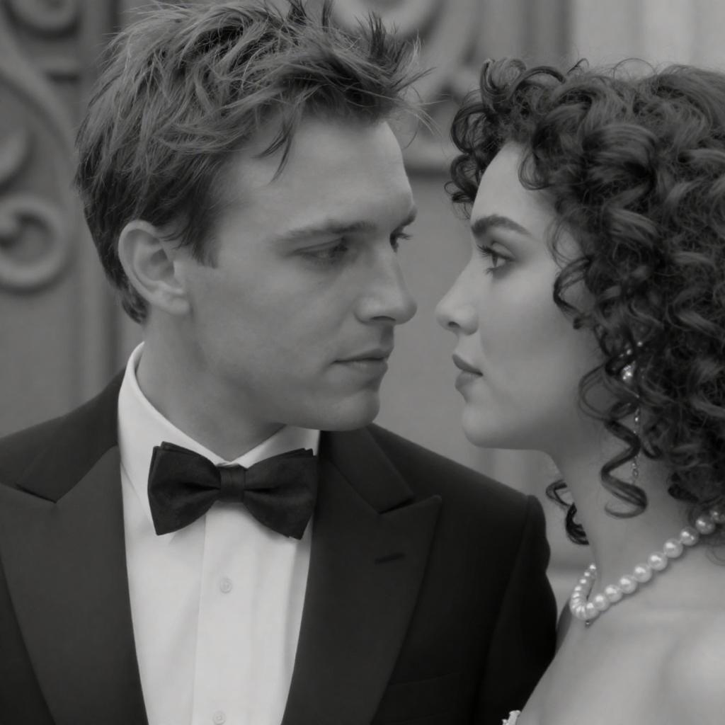 Black and white photograph of a man and woman in close profile. Man with slicked-back hair, white shirt, and light jacket. Woman with curly hair, dark dress, and arm accessory. Man looks down, woman looks up. Background blurred, dark. Woman's hand on man's neck. Intimate, serious expressions.