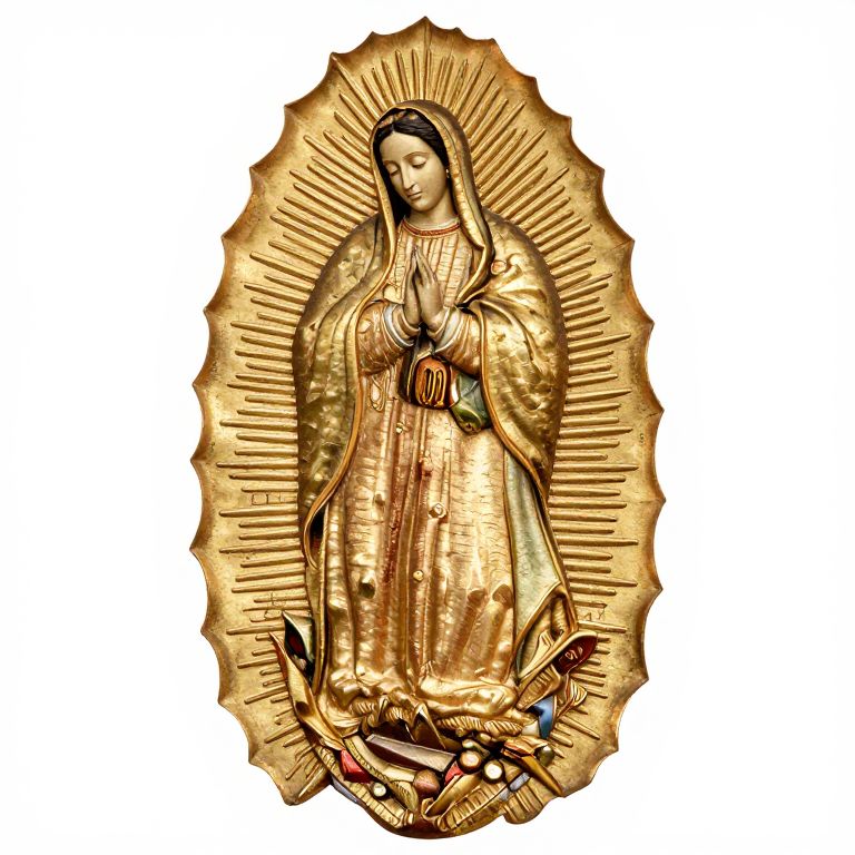 Gilded religious icon of a serene Mary with hands in prayer, surrounded by radiant rays, wearing a golden robe, standing on a decorative base. Digital