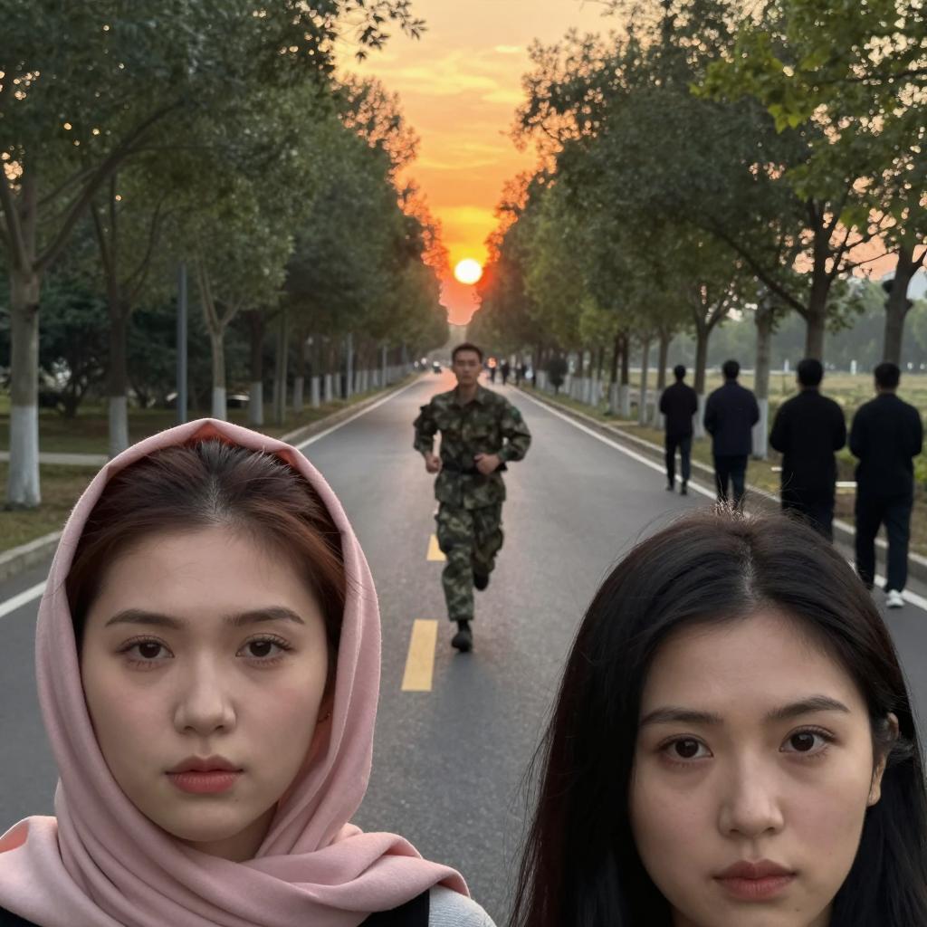 Two young Asian women with serious expressions in the foreground, one wearing a pink headscarf, the other with black hair. Behind them, a man dressed in camouflage military uniform runs down a tree-lined road during sunset. Additional figures dressed in black clothing stand on the right side of the road under a vibrant orange sky.