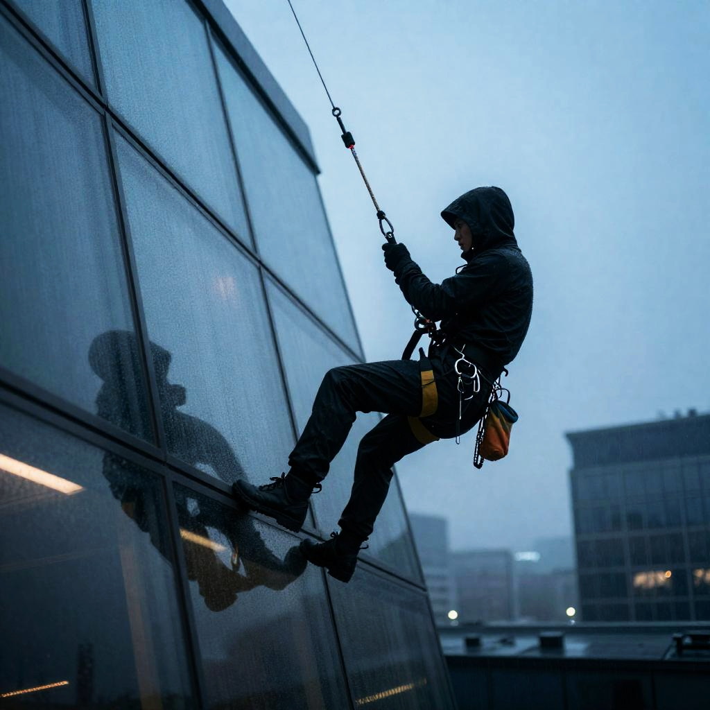 Dynamic scene of a daring thief using a grappling hook to scale an angled glass atrium facade under a rain-swept neon dusk.