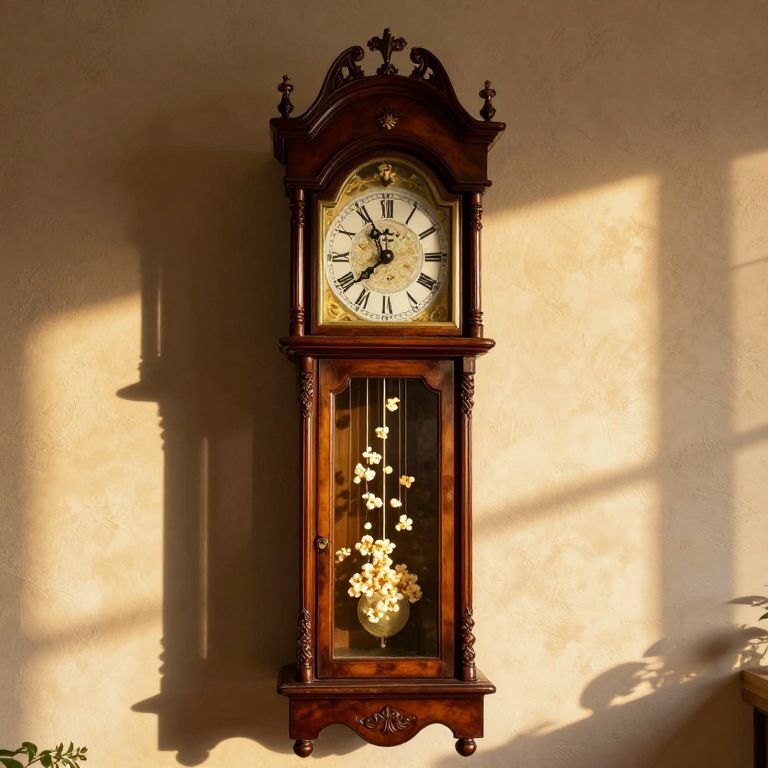 Photograph of an ornate, vintage wooden grandfather clock with a dark brown finish, standing against a beige wall. The clock face has black Roman numerals and black clock hands on a white background. Below the clock face, there is a glass-encased section displaying a bouquet of white flowers with yellow centers. The clock is illuminated by warm sunlight casting shadows on the wall. The wooden clock has intricate carvings at the top and bottom. The overall style is classic and elegant.