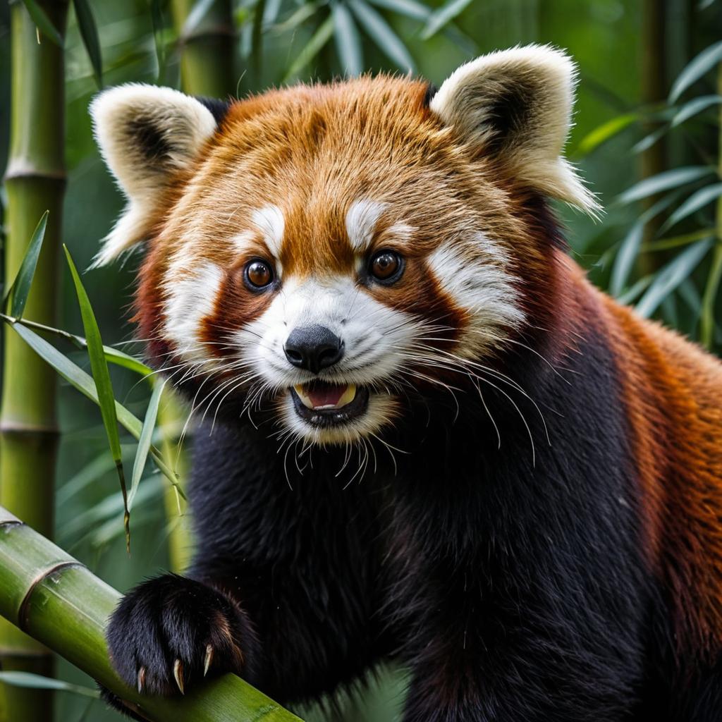 A breathtaking and ultra-realistic 8K photograph showcasing the raw power and majesty of a red panda, the king of the bamboo forests.