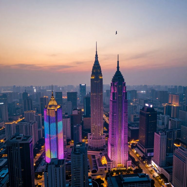 Photograph of a cityscape at dusk with illuminated skyscrapers, including a vibrant purple and blue tower, and a twin-towered building in pink