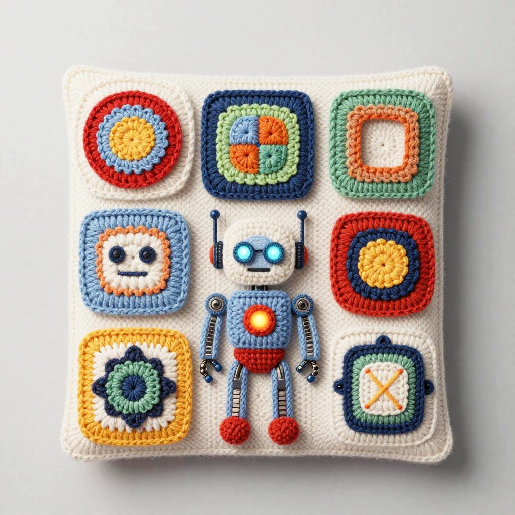 Stylized AI crochet pattern featuring abstract geometric shapes interwoven with robotic elements, vivid multi-colored threads glowing softly, emphasizing handcrafted textures alongside modern tech design, cozy and innovative craft art, clean background.