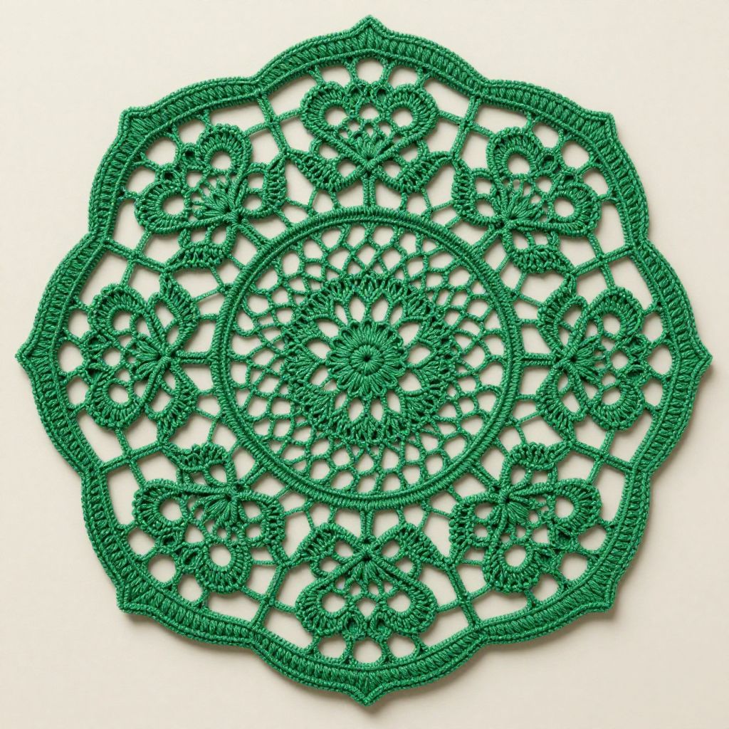 Circular green crochet doily featuring intricate mandala patterns, symmetrical bow motifs, and concentric rings, elegantly displayed against a neutral background.