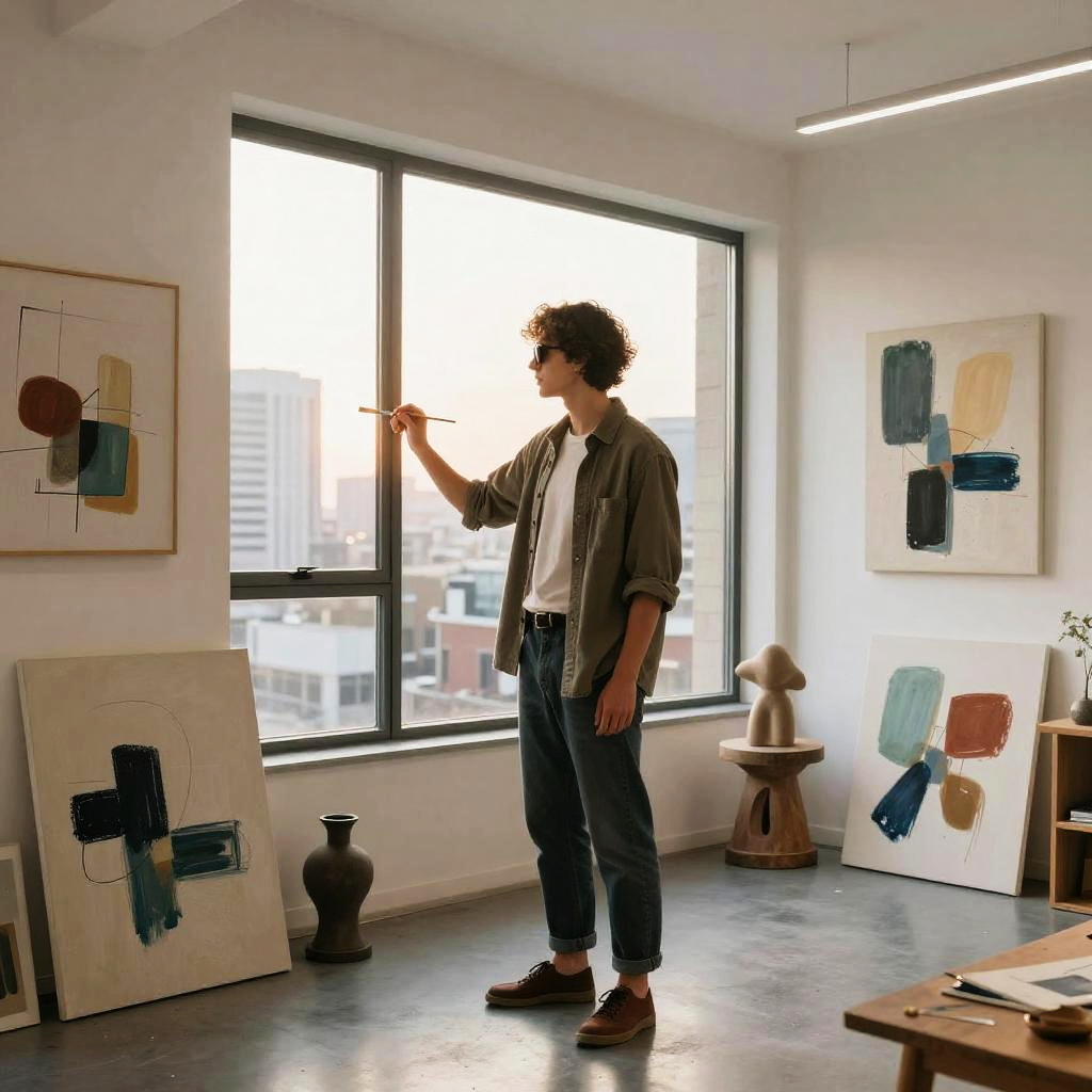 Lui, a stylish modern artist in a minimalist urban studio filled with abstract paintings and sculptures, wearing casual chic attire and sunglasses, holding a paintbrush mid-stroke, framed by large windows overlooking a bustling cityscape at sunset.