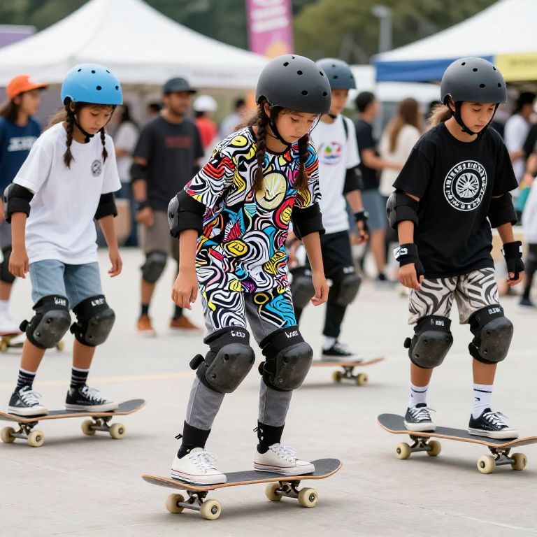 Skate-inspired outfits on a diverse group of young riders at a summer street festival, featuring abstract patterns, reflective materials, and custom logos blending skate culture with pop art aesthetics.