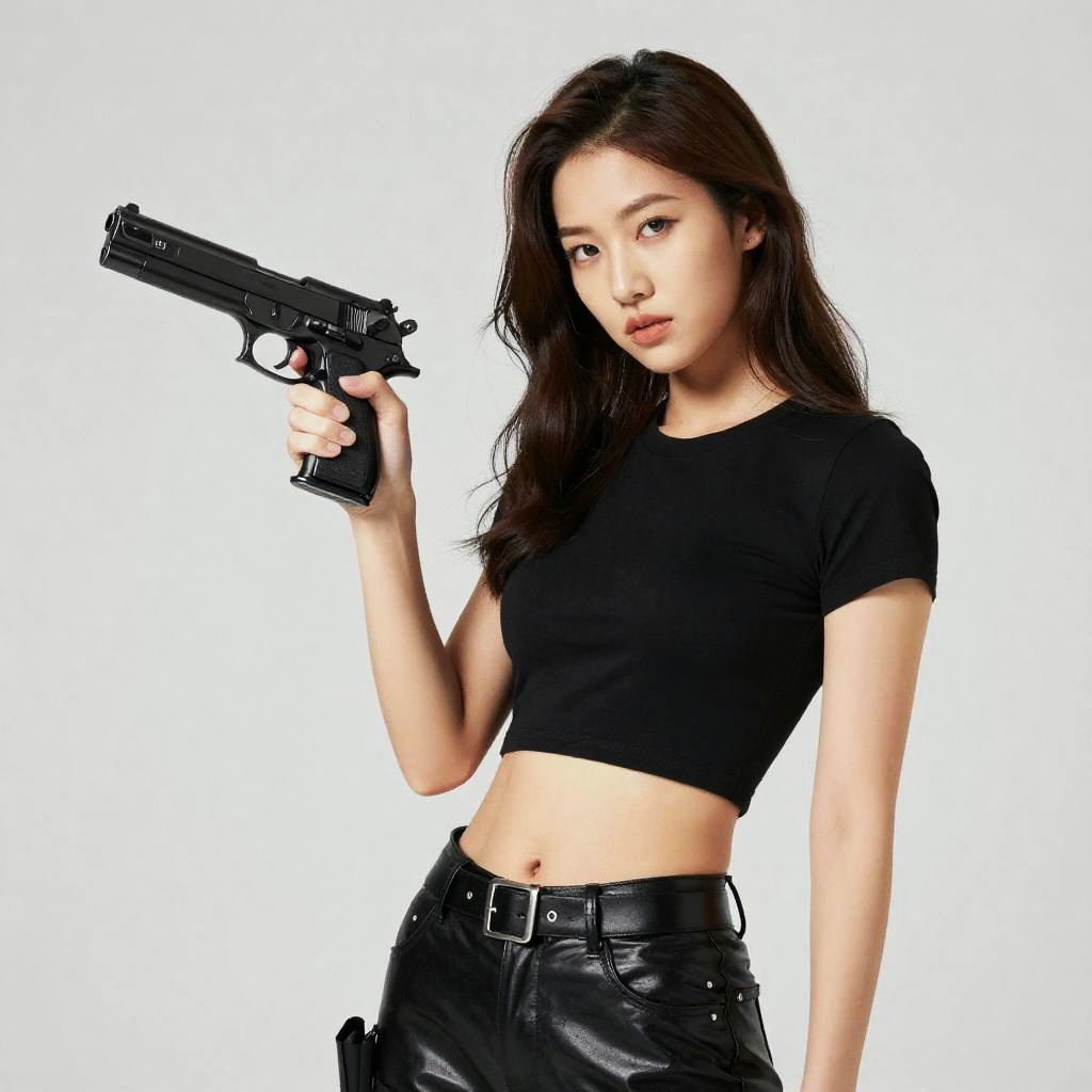Photograph of an Asian woman with long black hair, wearing a black crop top and shorts, holding a handgun, white background.