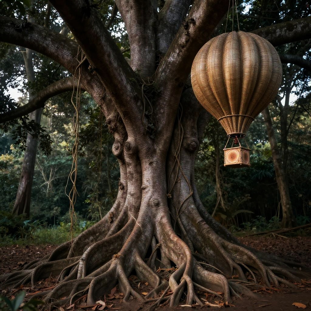 Colossal ancient tree, intricate rootwork, woven hot air balloon, close-up detail, bark texture, hanging vines, twilight forest floor, dappled light, botanical illustration style, scientific diagram, hyperrealistic, cross-section