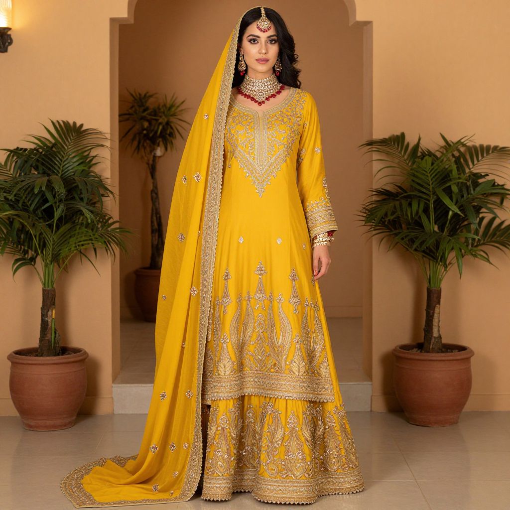 Model showcasing vibrant yellow unstitched Pakistani bridal wear featuring intricate embroidery, paired with ornate jewelry and flanked by potted plants in a warmly lit indoor setting.