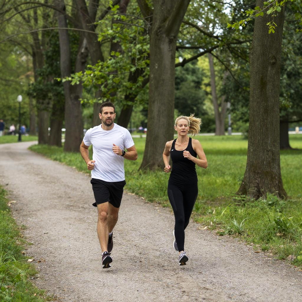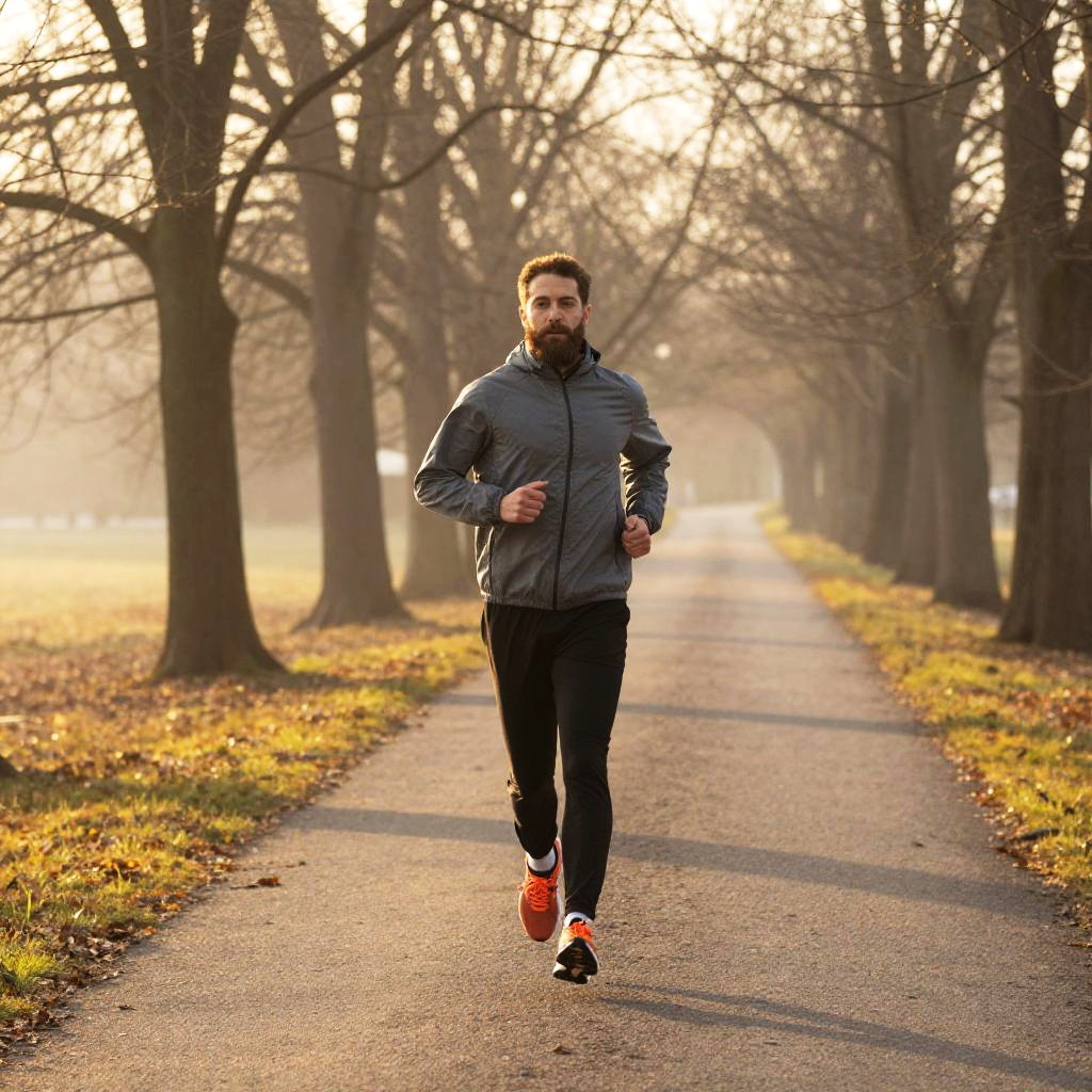 A photograph of a person jogging down a forest path at sunset. The runner, wearing a black jacket and black pants with red stripes on the ankles, is seen from behind. Tall, leafless trees line both sides of the path, casting long shadows. The ground is covered in fallen leaves, and the sunlight filters through the trees, creating a warm, golden glow.