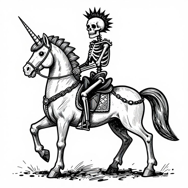 Scribble illustration or drawing in black ink of a skeleton riding a unicorn in style of Punk or alternative subculture iconography,