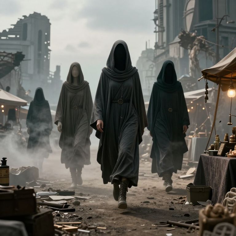 Photograph of a foggy, ruined marketplace with four hooded figures in dark, flowing robes walking towards the camera. The figures, with obscured faces, wear heavy, tattered cloaks and rugged boots. The background shows dilapidated buildings and stalls with scattered goods, including bottles and baskets. Warm, yellow lights from market stalls contrast with the cool, misty atmosphere. The ground is littered with debris, and the overall scene evokes a post-apocalyptic or medieval setting. The image is highly detailed, capturing textures of the cloaks and market items, with a dramatic, moody lighting style.